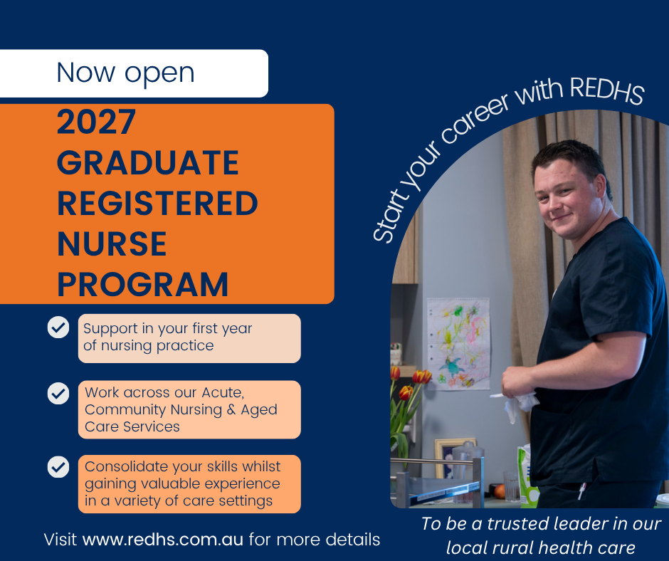 Joining REDHS’ Graduate Registered Nurse program, you will be supported in your first year of nursing practice, consolidating your clinical skills whilst gaining valuable experience working across our Acute, Community Nursing and Aged Care Services.